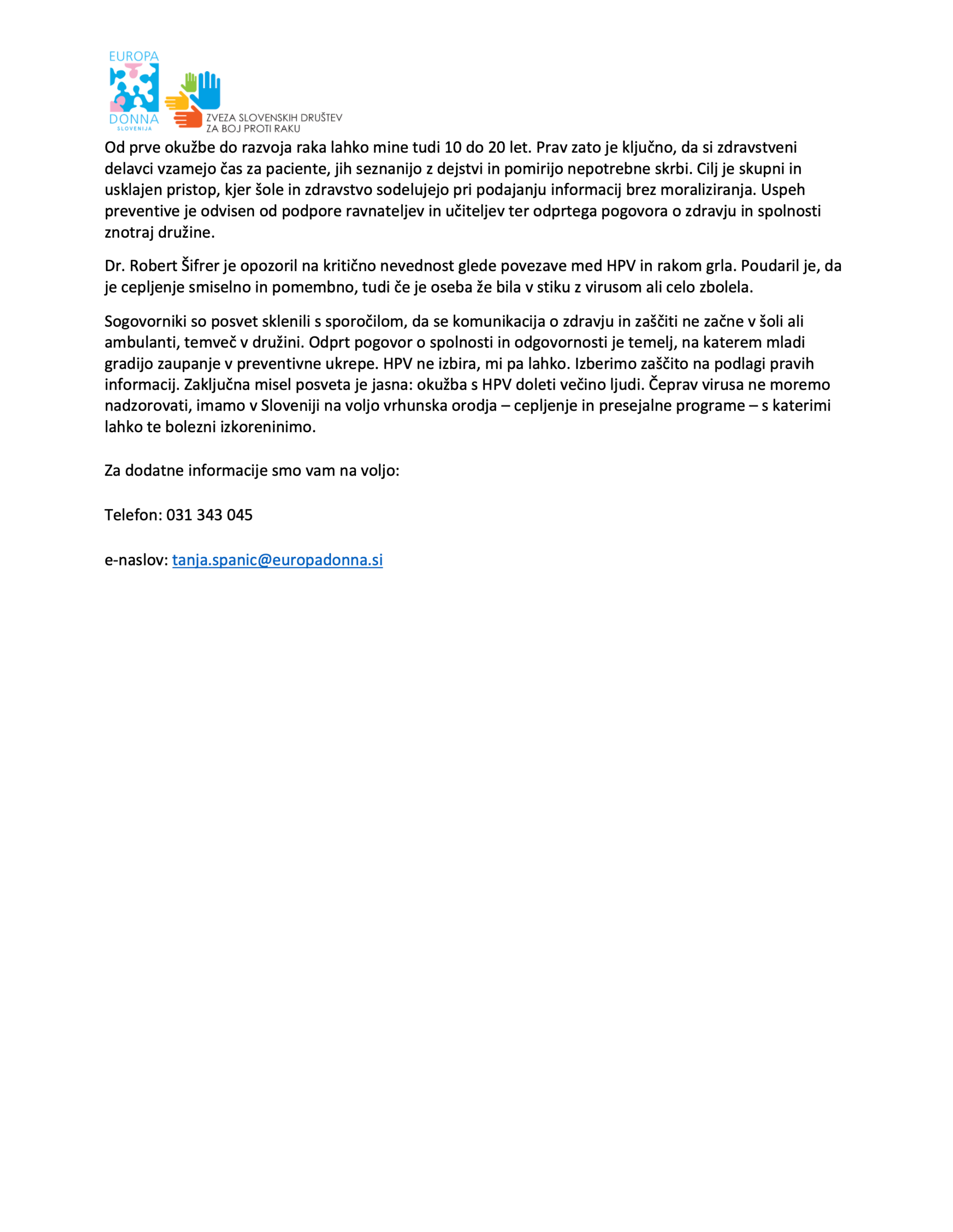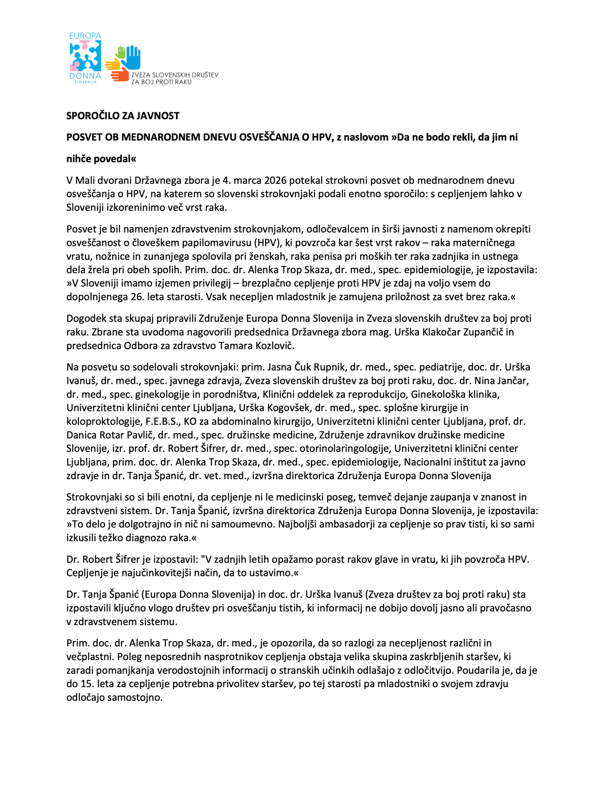 Ob mednarodnem dnevu osveščanja o okužbah s človeškim papilomavirusom (HPV) sta Europa Donna Slovenija in Zveza slovenskih društev za boj proti raku v Mali dvorani Državnega zbora Republike Slovenije organizirali strokovni posvet z naslovom »Da ne bodo rekli, da jim ni nihče povedal«.